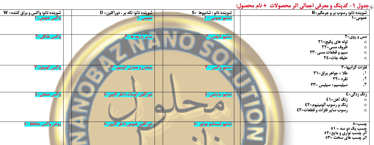 جدول شماره یک : کدینگ راهنمای محصولات نانوباز