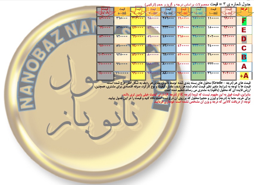 (توجه: هر 50میلی لیتر #NANOاضافه، دارای 20هزارتومان تخفیف می باشد. مثلا: اگر به جای 50 میل، شما 150میل خریداری نمایید دارای 40هزارتومان تخفیف در تمام کلاس های محلولات نانوباز می باشید که در جدول نیز اعمال شده است.