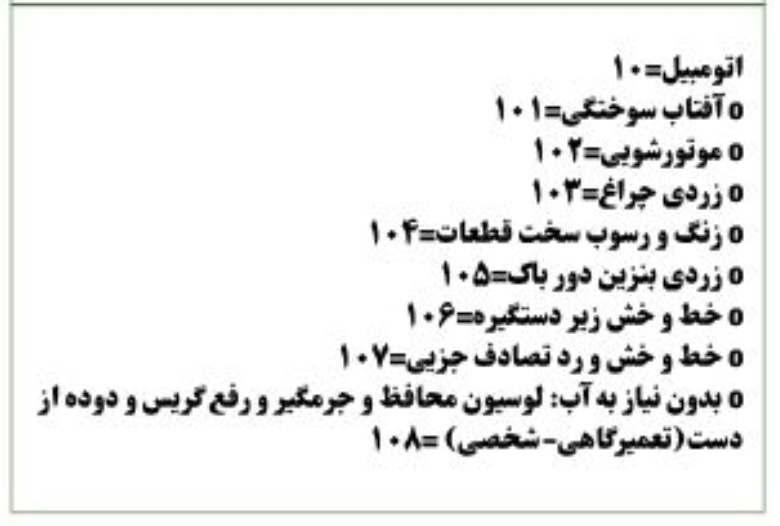 رسته ها:(براساس کد تولیدی در جدول شماره ی 1 خانگی دستگاه های صنعتی اتومبیل اشیاء گرانبها سفارشی و غیره